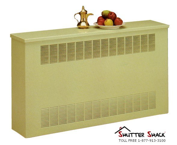 Another radiator cover with slatted grille on upper 1/3 and bottom 1/3 portion of cover and square edges.